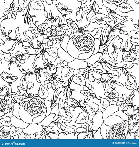 Floral Seamless Pattern Made Of Elegant Flowers Outline Detailed Sketch