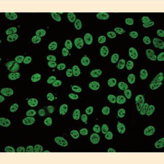 (A) Nuclear fine speckled tending to be homogeneous. Cells present